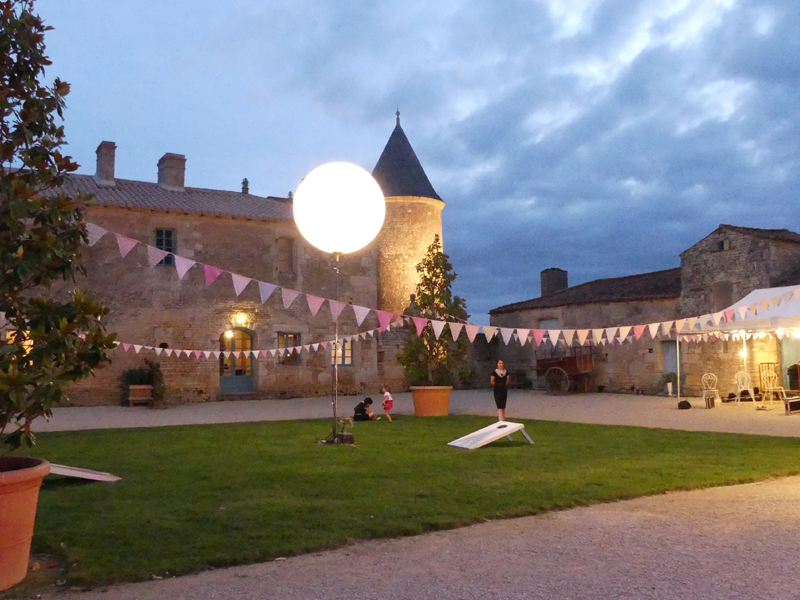 Des salons de jardin en fer forgés blancs sont mis à votre disposition. Et le soir, un ballon-lune éclaire de sa douce lumière la cour où vous savourez ces moments de fête !